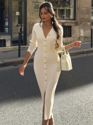 Trendix Elegant Evening Dress Women V Neck Long Sleeve Patchwork Button Slit Sweater Dresses 2024 Autumn Winter Knit Maxi Dress