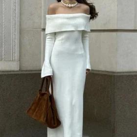 Trendix Off Shoulder Elegant Knit Dress Women Autumn Street Sexy Backless Long Sleeve Dresses Winter Knitwear Maxi Evening Dress