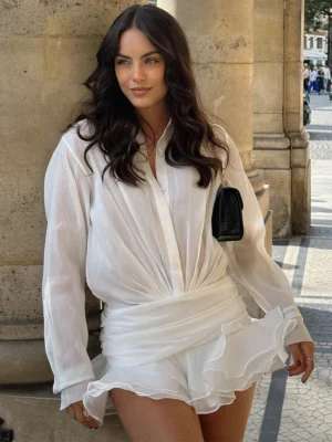 Trendix Oversized Chiffon Mini Dress Women Loose Pleated Deep V Neck See Through Dresses Club Sexy Vacation Beach Shirt Dress