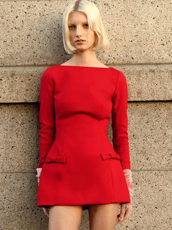 Trendix Patchwork Ruffle Mini Dress For Women V Neck Bodycon Long Sleeve Short Dresses Femme Backless Bow Bandage Elegant Dress